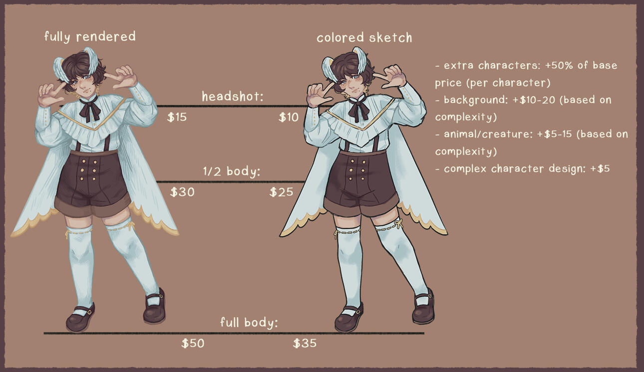 payment will be accepted after completion for any commission under $40, others can be paid half up-front half at completion or entirely up-front.payment accepted via paypal or ko-fi
